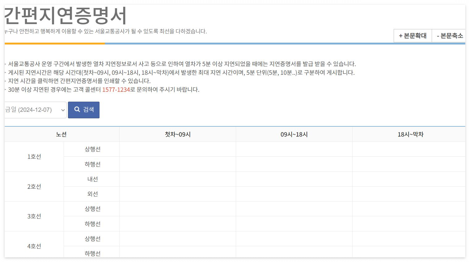 서울교통공사 누리집에 접속하면 지하철 간편지연증명서 발급 페이지를 찾을 수 있습니다.