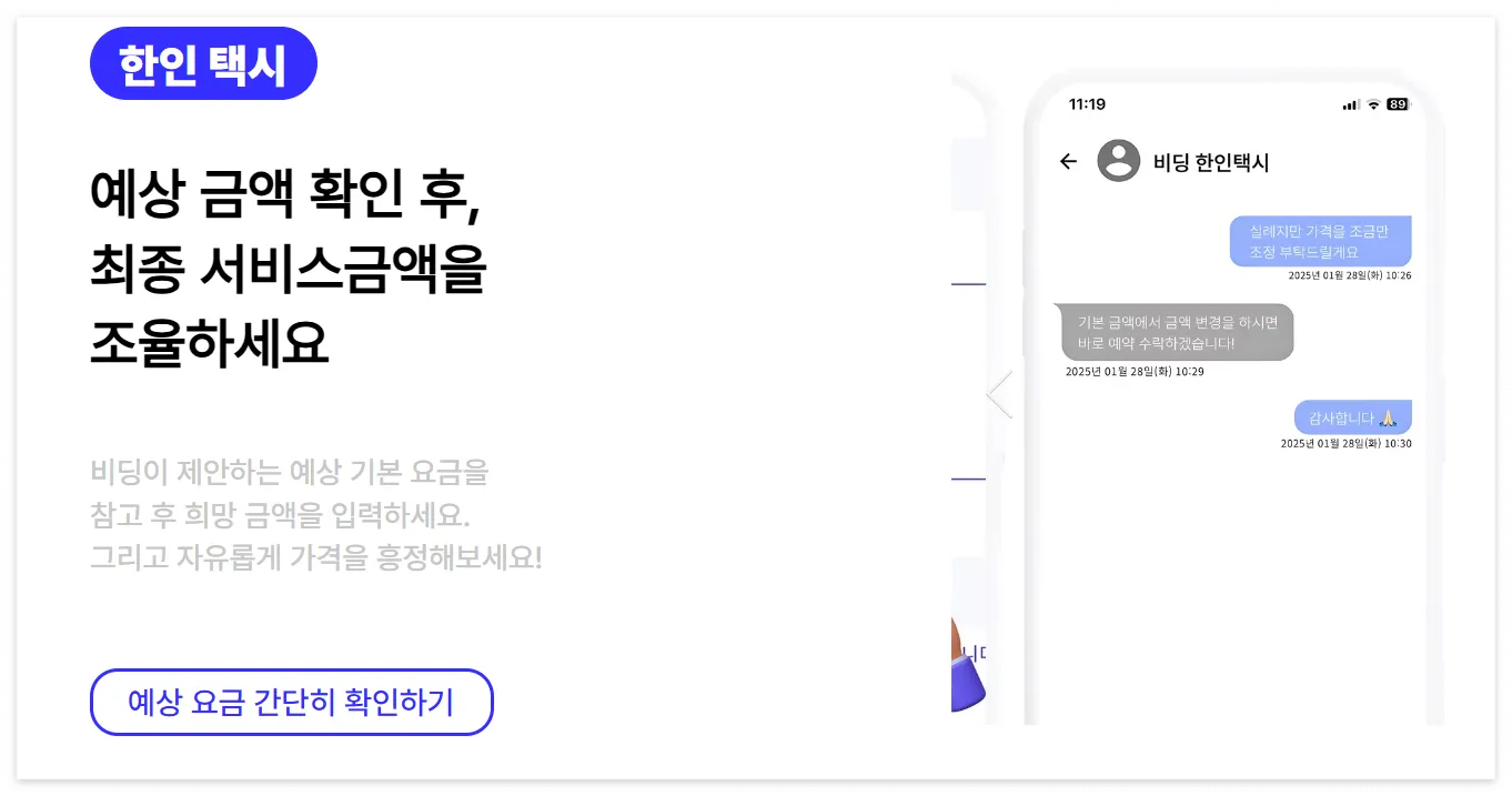 | 한인 택시 | 예상 금액 확인 후, 사용자 희망 금액 제시 가능 | 자유로운 가격 흥정 가능 |